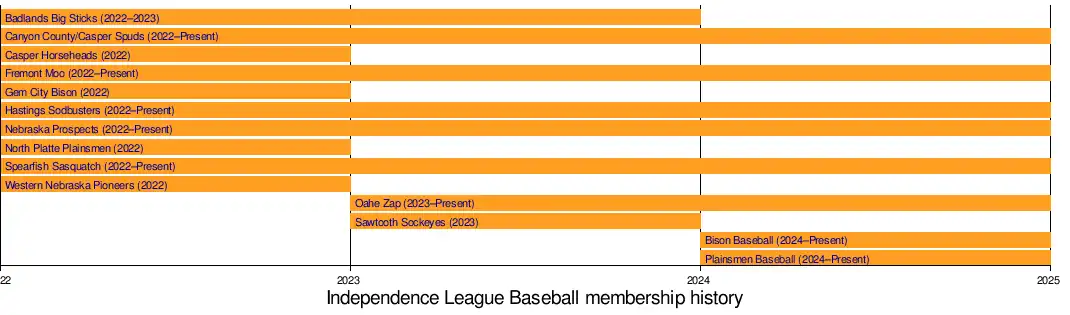 Independence League Baseball is a collegiate summer baseball league in the United States with teams playing in Nebraska, South Dakota, and Wyoming.[1] The league played its inaugural season in 2022 with ten teams[2] and had eight teams for 2023.[3] As of January 2024, eight teams are listed for the 2024 season.[4]