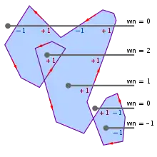 Visualization of Dan Sunday's winding number algorithm. A winding number of 0 means the point is outside the polygon; other values indicate the point is inside the polygon