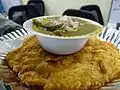 | Chole bhature | ![]() ![]() | A combination of chana masala (spicy chick peas) and fried bread called bhatura (made of maida flour),[8] different varieties of bhature are available, such as aloo bhatura (filled with boiled potato) and paneer bhatura (filled with paneer). Pictured at top is chana masala, and bhatoora is below. |