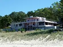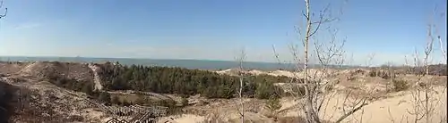 City West was one of several "ghost towns" situated in the dunes. Planned as a rival to Chicago,[6] it was partly built in 1837 but failed that summer, during a national economic panic. The remains of the town, partly carted off to be used as lumber, were located near where the pavilion in the state park now stands, until a forest fire in the 1850s destroyed whatever was left.[6] Today, most of the coastline has been settled for use as homes, factories, and businesses, with some areas reserved for public parks.