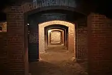 The passages and walkways include brick archways and limestone columns that were part of Tomlinson Hall, a building that opened in 1886 and was destroyed by fire in 1958.[1][2] Tomlinson Hall was a public auditorium located immediately west of the Indianapolis City Market. The catacombs served as a more convenient way to transport and store goods from the above-ground marketplace and contains pits used to store ice.[2] Indiana Landmarks offers 30-minute tours on various Saturdays during the year.[3]