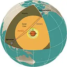 The main observational constraints on inner core rotation come from seismology. When an earthquake occurs, two kinds of seismic wave travel down through the Earth: those with ground motion in the direction the wave propagates (p-waves) and those with transverse motion (s-waves). S-waves do not travel through the outer core because they involve shear stress, a type of deformation that cannot occur in a liquid. In seismic notation, a p-wave is represented by the letter P when traveling through the crust and mantle and by the letter K when traveling through the outer core. A wave that travels through the mantle, core and mantle again before reaching the surface is represented by PKP. For geometric reasons, two branches of PKP are distinguished: PKP(AB) through the upper part of the outer core, and PKP(BC) through the lower part. A wave passing through the inner core is referred to as PKP(DF). (Alternate names for these phases are PKP1, PKP2 and PKIKP.)[12] Seismic waves can travel multiple paths from an earthquake to a given sensor.[13]