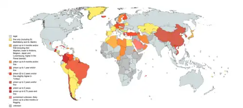 Insult is the infringement of another human's honor by whatsoever means of expression,[1][2] in particular an offensive statement or gesture communicated, and is a crime in some countries.[3][4][5] In a few countries seen as the same, in most the distinction between insult and defamation is that, from a focusing point of view, the former ascribes a value whereas the latter attributes or imputes a fact.[6]