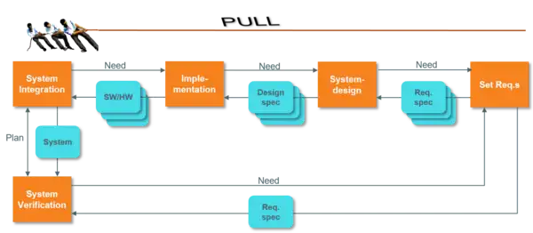 Pull, in this context, means that information is requested from the user when needed (or is planned to be integrated and tested), as opposed to delivered when it happens to be ready. Development planning has to adjust to the optimal order of integration. System implementation is driven by what is going to be integrated and tested. System design, in turn is driven by the planned implementation and requirements by the planned system design steps. By doing so, artifacts will be delivered just-in-time, thus enabling fast feedback.