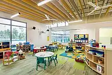 The Ampang campus, which began use from August 2018, is set on approximately 10 hectares (25.7 acres) in Ampang Hilir.[26] The campus has state-of-the-art facilities catering to both athletics and the arts. Athletic facilities include: an indoor fitness center, an Olympic-sized track; three sports fields; an Aquatic Complex including a 50-metre Olympic-sized swimming pool built accredited by FINA,[27] two gyms, an indoor climbing wall, tennis courts and playgrounds.[28][29] Arts facilities include The Dr. Norma J. Hudson Amphitheater, the Robert B. Gaw Theater and the Melawati Theater: available for student meetings, music recitals, presentations, plays and other arts-centric performances;[30][31] ISKL's 'green' facility is the first International school in Malaysia to achieve platinum Green Building Index (GBI) status with environmentally sustainable concepts.[32][33]
