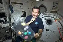 - ↑ Chris Hadfield [@cmdr_hadfield] (September 24, 2016). "Easter Eggs :) The crew loved them, a surprise for each, full of chocolate and small gifts from home" (Tweet) – via Twitter.
