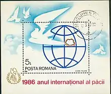 The logo of the International Year of Peace is two hands releasing a white dove surrounded by a laurel crown similar to the UN emblem. This logo appears in different postage stamps and on the advertising board during the 1986 FIFA World Cup in Colombia.