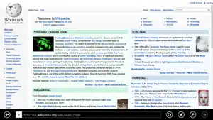 The UI can be revealed by a right click of the mouse or by a swipe from the top or bottom edges of a touchscreen.[36] When the UI is shown, the tabs are listed on the top of the screen, with a small preview of the webpage on each tab. A button to add a new tab is placed in the top-right corner. At the bottom of the screen, the address bar and navigational buttons are shown. Navigational buttons include the Back button (to navigate to the previous page), the Refresh button (to reload active page), the Pin button (which create a new shortcut tile for the active page on the Start screen), and a wrench-shaped icon, which opens the only menu of IE10. It contains options such as "View on Desktop", which opens the current webpage on the desktop version of Internet Explorer 10, and "Find on page", which can find a text string (a word, phrase or arbitrary set of letters) in the active page.[36]