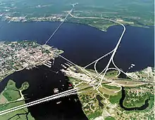 Aerial photograph of US 70 bypassing the city of New Bern, crossing the Trent River; US 17 can be seen crossing the Neuse River in the background