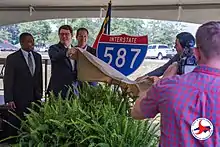 On September 7, 2016, Governor Pat McCrory said he would ask for the section of US 264 between Zebulon and Greenville to be designated an Interstate Highway. The justification for Interstate status was that Greenville was the 10th largest city in the state and had no Interstate connecting it.[10] On November 14, AASHTO approved the Future I-587 designation; followed by Federal Highway Administration (FHWA) approval on November 21.[11][12][13] In April 2017, NCDOT began posting Future I-587 signs along the length of the route.[14] On May 10, 2021, AASHTO approved the establishment of I-587, between I-95 and Greenville.[15] This was further approved on November 16, 2021, marking the designation official.[16] Signage for the designation went up on June 20, 2022.[17]