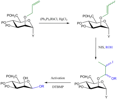 The glycosyl donor is protected at C-2 by OAll group. The allyl group is then isomerized to a prop-1-enyl ether using a rhodium hydride generated from Wilkinson's catalyst ((PPh3)3RhCl) and butyllithium (BuLi). The resulting enol ether is then treated with NIS and the glycosyl acceptor to generate a mixed acetal. The 1,2-cis (e.g. β-mannosyl) product is formed in a final step through activation of the anomeric leaving group, delivery of the aglycon from the mixed acetal and finally hydrolytic work-up to remove the remains of the propenyl ether from O-2.[4]