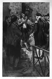Montgomery then led his troops north and occupied Saint Paul's Island in the Saint Lawrence River on November 8, crossing to Pointe-Saint-Charles on the following day, where he was greeted as a liberator.[34] Montreal fell without any significant fighting on November 13, as Carleton, deciding that the city was indefensible (and having suffered significant militia desertion upon the news of the fall of St. Johns), withdrew. He barely escaped capture, as some Americans had crossed the river downstream of the city, and winds prevented his fleet from departing right away. When his fleet neared Sorel, it was approached by a boat carrying a truce flag. The boat carried a demand for surrender, claiming that gun batteries downstream would otherwise destroy the convoy. Based on uncertain knowledge of how real these batteries were, Carleton elected to sneak off the ship, after ordering the dumping of powder and ammunition if surrender was deemed necessary. (There were batteries in place, but not nearly as powerful as those claimed.)[35] On November 19, the British fleet surrendered; Carleton, disguised as a common man,[36] made his way to Quebec City. The captured ships included prisoners that the British had taken; among these was Moses Hazen, a Massachusetts-born expatriate with property near Fort St. Johns whose poor treatment by the British turned him against them. Hazen, who had combat experience in the French and Indian War and went on to lead the 2nd Canadian Regiment throughout the war, joined Montgomery's army.[37]