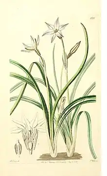 The genus was originally described in 1836 by Constantine Samuel Rafinesque, based on Ipheion uniflorum, separating it from Milla uniflora Graham (now Tristagma).[1] The original description was unifloral inflorescences with white flowers, spathe formed by one bifid bract, staminal filaments independently fused to the perigonial tube and the fruit being a clavate trilocular capsule.