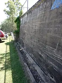 The northern platform (1934) is roughly square in plan and features a centenary memorial entrance gate (1967) on the corner, at the intersection of Downs and Fitzgibbon Streets. Concrete stairs, centred on the northern and western retaining walls, also provide access from the street. Block A is prominently sited on the platform, set back from Fitzgibbon Street behind a symmetrically arranged landscaped area with garden beds and a semicircular concrete pathway. A parade ground to the south of the building has a bitumen surface with line markings for a basketball court. A row mature fig trees (Ficus sp.) is situated in a grassed area to the west of the parade ground. Concrete stairs punctuate the retaining wall between the north and south platforms, which is painted with murals.[1]
