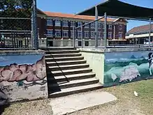 The undercroft level has a perimeter of rendered piers and walls and is primarily open play-space. The central piers are face brick that have been painted with bright colours and murals. Bathrooms are located at the east and west ends. They retain original layouts and v-jointed (VJ) timber lined partitions. The floor is concrete and the area under the western wing has outlines for hopscotch and other games inscribed into the slab. Timber bench seats are situated between the perimeter piers.[1]