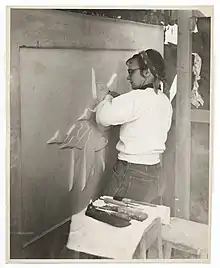 ![]() Irene Emery (c. 1937) carving wall of sun bath at Carrie Tingley Hospital for Crippled Children at Hot Springs, New Mexico[1] | |