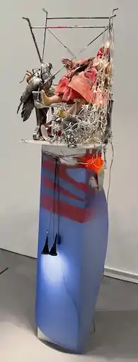 Since the end of the second half of the 1990s, Genzken has been conceptualizing sculptures and panel paintings in the shape of a bricolage of materials taken from DIY stores and from photographs and newspaper clippings.[19] She often uses materials that underline the temporary character of her works. As part of her deep-set interest in urban space, she also arranges complex, and often disquieting, installations with mannequins, dolls, photographs, and an array of found objects. New Buildings for New York are assembled from found scraps of plastic, metal and pizza-box cardboard.[20] The assemblages from the Empire/Vampire, Who Kills Death series, originally comprising more than twenty sculptures that were created following the attacks of September 11, are combinations of found objects – action figures, plastic vessels, and various elements of consumer detritus – arranged on pedestals in architecturally inspired, post-destruction scenes.[21] Elefant (2006) is a column of cascading vertical blinds festooned with plastic tubes, foil, artificial flowers, fabric and some tiny toy soldiers and Indians.[22] For her installation Oil, the artist transformed the German Pavilion at the 2007 Venice Biennale into a futuristic and morbid Gesamtkunstwerk.