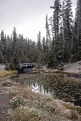 Isa Lake is located in Yellowstone National Park, in the U.S. state of Wyoming.[2] The lake straddles the continental divide at Craig Pass. Indigenous peoples have lived in the Yellowstone region for at least 11,000 years.[3] In the 1800s, at the time of the first European exploration of the area, the region was home to several Indigenous Nations including the Nimíipuu, Absaroke, and Shoshone Nations. Hiram M. Chittenden became the first known European to sight the lake in 1891, while searching for the best routes connecting Old Faithful and the West Thumb Geyser Basin. Chittenden named the lake after Miss Isabel Jelke, from Cincinnati, though it is not clear why.[4][5]