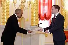 Lamba presenting his credentials to Dmitry Medvedev in February 2010.
