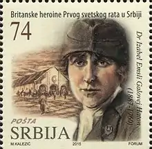 Hutton on a 2015 stamp of Serbia from the series "British Heroines of the First World War in Serbia".