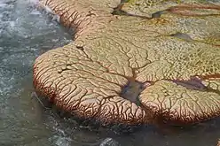 Istisu resort is located in the town of the same name, in Kalbajar District of Azerbaijan, and at an altitude of 2,225 metres (7,300 ft). The springs here were formed as a result of swelling and cracking of the Earth's crust after a large seismic event in 30 September 1139, in Ganja.[1][9] Robert Hewsen writes that, in the early Middle Ages, the royal baths of the rulers of Caucasian Albania were located here,[10] though according to other scholars the healing properties of the springs have been known to the local population since the 12th century.[1] Istisu literally means warm water in Azerbaijani.[11] The resulting water has hyperthermic, carbon dioxide, hydro-carbonate-chloride-sulphate-sodium in it. There are 12 active mineral springs within the resort. The temperature of the mineral water is 58.8 celsius. These spring waters are rich in lithium, bromine, iodine, arsenic, phosphorus, zinc, copper, nickel, magnesium, iron and other chemicals. One of these springs has a fountain up to 8 meters high. Some 4 million litres of water are released annually from hot springs. Most of this water flows into rivers.[12]