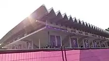Istora had a U-shaped indoor lobby attached on its front since some time after the 1960s to 2016. The court and tribune were surrounded by multi-functional rooms.[4] Those were demolished during the subsequent renovation.[5] The rooms are incorporated underneath the tribune, leaving no other buildings attached to it.