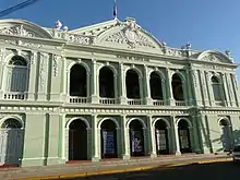Between 1890 and 1899, more than 6,500 Italians arrived in the country, the vast majority arriving at the port of Libertad, and among them several architects and other Italian professionals arrived, such as those who built the Teatro de Santa Ana in Santa Ana. In 1890, in fact, the construction of the Theater was entrusted to the company Sociedad Constructora de Occidente, directed by the Italian architects Francesco Durini Vasalli and Cristóbal Molinari.[16] In turn, the Italian artists Luis Arcangeli and Guglielmo Arone were hired. The theater's original curtain was in the Modernisme style, created by the Italian artist Antonio Rovescalli. Many other Italians have built various palaces and monuments in El Salvador.[2][1] In fact, in the country there are many churches and houses of Italian style, an example is the Iglesia del Calvario in Santa Ana, which was built and designed with the support of the Italians.[17]