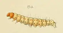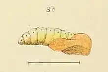 Hudson described the larvae of this species as being about 7⁄8 in. long when fully grown.[7] The head is dark brown and shiny while the body is white.[7] The pupa is pale ochreous in colour with a brown tinge to the head and lower portion of the pupa. It is enclosed in an oval cocoon made from silk and pieces of chewed bark.[7]