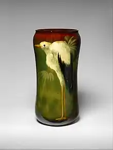 Owens Pottery was founded by J. B. Owens in Roseville, Ohio, in 1885.[1] In 1891 it moved to Zanesville, where Owens built a new factory on a site with its own rail spur.[2] It began producing art pottery in 1896, when it introduced the Utopian line with botanical decorations under a brown glaze.[3] All told, it produced some four dozen different lines of art pottery, with types ranging from vases, bowls, and pitchers to umbrella stands and lamps. Popular lines included Utopian, Lightweight, Lotus, Henri Deux, and Matte Green.[3][4] Especially distinctive lines include Red Flame (featuring slip decoration under a red glaze), Mission (depicting Spanish missions), and Coralene (featuring small bead decorations).[5]