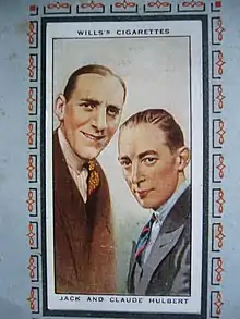 After Cambridge, he earned recognition and fame performing in musicals and light comedies.[3] However the First World War delayed his rise to fame; on 14 February 1916, while still an actor, he married Cicely Courtneidge, the daughter of Robert Courtneidge, a theatrical manager, in Hampstead.[1] On 2 March, the Military Service Act 1916 came into force and Hulbert was expecting to be conscripted into the army for the remainder of the conflict. However, he appears to have been exempted. In June 1916, Hulbert and Courtneidge were appearing together in a sketch called “A Lucky Mistake”,[4] and in December 1916 he was appearing at the Comedy Revue in "See-Saw".[5] In May 1917, he opened at the Comedy in "Bubbly", and the Illustrated Sporting and Dramatic News commented that "Mr. Jack Hulbert, Miss Winnie Melville, and Miss Irene Greville also stay on at this same munition factory for high explosives of laughter".[6] After the war, Hulbert continued his career in the theatre.[7][8]