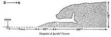 Jacobs Cavern is a small cave, hardly more than a rock shelter, and is entirely in the St. Joe Formation of the Mississippian subperiod. Its roof is a single flat stratum of limestone; its walls are well marked by lines of stratification; dripstone also partly covers the walls, fills a deep fissure at the end of the cave, and spreads over the floor, where it mingles with an ancient bed of ashes, forming an ash-breccia (mostly firm and solid) that encloses fragments of sandstone, flint spalls, flint implements, charcoal and bones. Underneath is the true floor of the cave, a mass of homogeneous yellow clay, one meter in thickness. It holds scattered fragments of limestone, and is itself the result of limestone degeneration. The length of the opening is over 21 meters; its depth 14 meters, and the height of roof above the undisturbed ash deposit varied from 1 m 20 cm to 2 m 60 cm The bone recess at the end was from 50 cm. to 80 cm. in height. The stratum of ashes was from 50 cm to 1 m 50 cm thick.