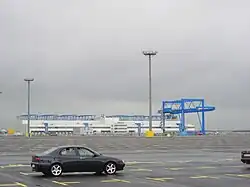 JadeWeserPort (German pronunciation: [jaːdə veːzɐ pɔɐ̯t]) is Germany's largest harbour project. It is supported by the states of Lower Saxony (50.1% stake) and Bremen (49.9% stake).[2] This new container port is located at Wilhelmshaven at the Jade Bight, a bay on the North Sea coast. It has a natural water depth in excess of 18 m. Container ships with a length of 430 m and 16,5 m draught will be able to call the JadeWeserPort at any tide. Construction work was begun in March 2008. The port was opened on 21 September 2012.[3] However, due to the Great Recession, the port wasn't given the warmest of welcomes, and very little TEU traffic flowed through the brand new harbour.[4] But the container handling could be raised from 60,000 in 2014 to 426,700 twenty-foot equivalent unit in 2015.[5] The yearly capacity of the port is 2,700,000 TEU.[6][7][8][9][10][11]