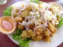 Jalea is a Peruvian cuisine dish consisting of fried fish, squid, and other seafood, originating in the northern region, specifically in the regions of Lambayeque and Piura, influenced by the Muchik.[1]