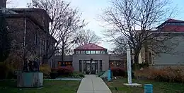 In mid-1988, the Bucks County commissioners approved $650,000 to build an art museum in the recently closed Bucks County Prison. Bucks County Council on the Arts became the organization charged with running the institution and their collected works became part of the museum collection.[3] James A. Michener, who grew up in Doylestown, took the lead in establishing the endowment, donating $500,000 as well as some of the paintings from his own private collection (Michener would go on to donate a total of $8.5 million to the museum).[4] The site was renovated by architects O’Donnell & Naccarato, Inc., from Doylestown, Pennsylvania. The warden's house and the control buildings were converted to office space and exhibition space. Part of the prison walls remain, which now provide a backdrop to the museum's outdoor sculpture and event pavilion. The museum was named the James A. Michener Art Museum, and opened to the public on September 15, 1988, at a ceremony presided over by Michener and his wife, Mari Sabusawa Michener.