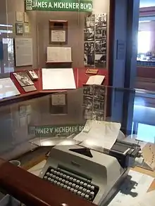 - "James A. Michener: A Living Legacy" - an exhibit dedicated to the museum's namesake, James A. Michener. This exhibit recreates his Bucks County office where he wrote Tales of the South Pacific. The exhibit features the desk, chair, typewriter, dictionary and other objects from the office in James A. Michener's Bucks County home where he lived and worked for more than 35 years.