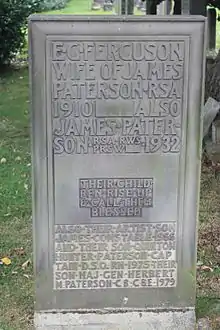 He is buried in Dean Cemetery just south of the huge Nasmyth monument in the north-east corner. His son James (Hamish) Constable Paterson (1890-1955) was also an artist and is buried with him.[8]