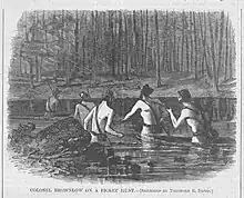 On July 4, 1864, General Johnston pulled his forces back over the Chattahoochee River and had almost all the ferry boats for miles in either direction destroyed. The fords were impassable because of heavy spring rains.[52] McCook's division remained near Soap Creek guarding the ferries. They exchanged gunfire from time to time with Confederates occupying rifle pits on the other side of the Chattahoochee.[52] On July 9, 1864, Brownlow's men were ordered to dislodge them and attempted to do so at a supposed ford near Power's Ferry. They found the river impassable.[53] Colonel Joseph Dorr of the 8th Iowa Cavalry Regiment, acting commander of the brigade, arrived on the scene and ordered Brownlow to complete the mission.[53] Brownlow then devised one of the most unusual raids of the Civil War, if not in all military history. He had most of his men keep up a steady fire from their side of the shore while he led a squad of nine men to a point about 1 mile (1.6 km) upstream where they put their guns and cartridge boxes on a small wooden raft and swam naked across the Chattahoochee.[54] Leaving one man to guard the raft, Brownlow led his naked men through the woods. As they somewhat painfully proceeded without shoes or other clothing for cover, Brownlow ordered them to "cuss low" so as not to give themselves away. When they reached the Confederate positions, they emerged, clothed only with cartridge boxes, screaming and shooting. The scene so startled the Confederate defenders that most of them immediately fled into the woods, leaving 12 men to be taken prisoner.[55] After swimming back across the river, Brownlow's men expressed even more admiration for their commander who was willing to share the hardships and dangers of the mission and not just to order others to carry out the unusual and uncomfortable task.[56][57] In an official report to his commander, McCook described the raid as one of Brownlow's "characteristic feats" and "a very successful raid for naked men to make."[58]