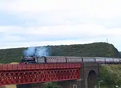 In 2005, the viaduct was strengthened during an eight-day closure of the railway.[2][3] 120 tonnes (118.1 long tons; 132.3 short tons) of steel and 600 cubic metres (21,000 cu ft) of high strength concrete were used to add a reinforced concrete slab underneath the track, in order to improve the load-carrying capacity to Network Rail's standards.[3] The work was worth around £5 million, and engineered by Corus and carried out by Mowlem.[4][5] 20,000 man-hours were worked during the period of closure, which coincided with a "possession" of the Forth Bridge.[2][3]