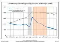 Development of population since 1875 within the current boundaries (Blue line: Population; Dotted line: Comparison to population development of Brandenburg state; Grey background: Time of Nazi rule; Red background: Time of communist rule)