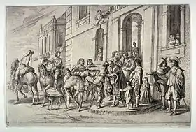 Jan Baptist de Wael was born in a painting family in Antwerp. His grandfather was the painter Jan or Jan Baptist de Wael who had been included by Anthony van Dyck in his "Iconography" (Icones Principum Virorum), a collection of portraits of leading personalities in van Dyck’s time. Jan Baptist the Younger's father was Lucas de Wael.[1] Lucas de Wael was not only a painter and engraver but also a dealer in art and luxury goods and had spent years in Italy, in particular Genoa, with his brother Cornelis de Wael. After Lucas had returned to Antwerp, Lucas and Cornelis, who had remained in Genoa, established a lucrative business trading in art and luxury items between Italy and Flanders. In Genoa, Cornelis' workshop was the centre of the colony of Flemish artists who resided in or passed through the city. Cornelis assisted them with their local integration, passed on recommendations to clients and formulated competition rules. When Anthony van Dyck visited Genoa, he had stayed with the brothers and Cornelis was one of his closest collaborators in the city.[2]