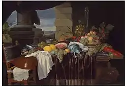 Some of his works are pronkstillevens, the sumptuous still lifes that were popular in Flanders and the Dutch Republic from the 1640s. A representative example in this genre is the Pronk still-life with fruit and a lobster, a lute on a chair, a landscape seen through a colonnade beyond (At Christie's London on 3-4 July 2012, lot 152), which represents a table laden with fruit, a ham, a lobster, a lute on a chair all placed in front of a landscape visible beyond a colonnade. Pronk still lifes are often interpreted as having a vanitas meaning.[7]