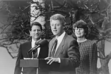 President-elect Bill Clinton had vowed to assemble an administration that "looked like America", and it was widely assumed that one of the major cabinet posts would go to a woman.[41][42] On February 11, 1993, Clinton introduced Reno as his nominee for United States Attorney General, stating that he wanted to hire a woman for the job but had also considered multiple male candidates.[39] Both of his previous choices, Zoë Baird and Kimba Wood, faced problems because both had employed undocumented immigrants as nannies.[7] Clinton said he had discounted Reno early in his search because she did not have experience in the Justice Department or federal law, but ultimately he came to understand that she had experience with a variety of criminal law issues from her role as State Attorney.[39][43] On March 11, 1993, the Senate confirmed Reno by a vote of 98 to 0.[44][45] She was sworn in the next day, becoming the first woman to serve as U.S. Attorney General.[41][46] As Attorney General, Reno oversaw the Justice Department and its 95,000 employees.[47] Reno remained Attorney General for the rest of Clinton's presidency, making her the longest-serving Attorney General since William Wirt in 1829.[7]