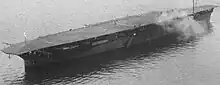 Hōshō was laid down by the Asano Shipbuilding Company in Tsurumi-ku, Yokohama, on 16 December 1920. She was launched on 13 November 1921 and towed to Yokosuka Naval Arsenal for completion on 10 January 1922. Hōshō was delayed by repeated design changes and late deliveries of equipment, pushing the commissioning date from March to 27 December 1922. She was commissioned lacking much of her aviation equipment, and did not begin landing trials until 22 February 1923.[19] The first landings were made by British pilots under contract, who were quickly replaced by Japanese pilots trained by the British Aviation Mission.[20] After Hōshō was commissioned, experienced aircrews requested changes, and the ship was modified by the shipyard from 6 June to 20 August 1924. The island, tripod mast, and aircraft crane were removed since they partially obstructed the flight deck and obscured pilot visibility. The forward part of the flight deck was made horizontal, and the 8 cm AA guns were moved forward, close to the position of the former island and out of the way of landing operations.[21] Another reason for removal of the island was that the IJN found that it was too small and cramped to be of effective use in controlling air operations or conning the ship.[3] After the island was removed, the carrier's flight operations were controlled from a platform extending from the side of the flight deck, a design that would be repeated in subsequent Japanese aircraft carriers.[22] The ship was then assigned to the 1st Fleet until 15 November 1924.[21]