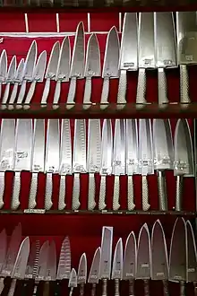 A Japanese kitchen knife is a type of a knife used for food preparation. These knives come in many different varieties and are often made using traditional Japanese blacksmithing techniques. They can be made from stainless steel, or hagane, which is the same kind of steel used to make Japanese swords.[1] Most knives are referred to as hōchō (Japanese: 包丁/庖丁) or the variation -bōchō in compound words (because of rendaku) but can have other names including -kiri (〜切り, lit. "-cutter"). There are four general categories used to distinguish the Japanese knife designs: handle (Western vs. Japanese), blade grind (single bevel vs. double bevel), steel (stainless vs. carbon), and construction (laminated vs. monosteel).