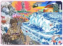 • Yoshimoto created this series based on the aftermath of disasters; both manmade and natural. He paints his subject matters using large color field areas to bring awareness to the human suffering that lingers to this day.[7] Images of his artistic process and artwork can be seen in a 2012 New American Painting article[8] and on Art Works for Change.[9] He started this series in response to the Japan earthquake in 2011 which triggered tsunamis and fires and caused thousands of people to lose their lives or livelihoods.[6] Yoshimoto has used this series to memorialize victims and to help raise money for Tsunami survivors.[10]