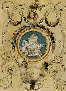 The Bains du Roi, the Salon de la Méridienne, part of the bedchamber of Madame Adelaide, and the Garde-robe of King Louis XVI of France were among the achievements which there can be little doubt were shared in by Rousseau de la Rottière. His most individual and most famous undertaking was, however, the decoration of the Boudoir de Madame de Sévilly, now at the Victoria and Albert Museum. This little room, measuring 4 x 3 m and almost 5 m high, was removed from the house in the Rue de Saint Louis, in Le Marais. The Seigneur de Sévilly, who was hereditary Trésorier Général de l'Extraordinaire des Guerres under Louis XVI, married his cousin Anne Marie Louise de Pange, a favorite maid-of-honor of Marie Antoinette, and the story runs that Mme de Sévilly and the queen, wanting to give him a surprise, had the room decorated during his absence from Paris. It was purchased for the museum for 60,000 francs in 1869. The wall paintings of this sumptuous room came from the hand of Rousseau de la Rottière; the overdoor and part of the ceiling were executed by Lagrene le jeune; the architect was Ledoux; the grey marble figures of aged men on either side of the fireplace were sculptured by Clodion; the mounts of the chimneypiece are apparently from the chisel of Gouthire.