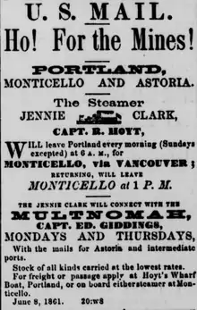 In February 1855, two steamboats were running daily between Oregon City, and Portland, the Jennie Clark and the Portland.[8] John C. Ainsworth commanded Jennie Clark at that time.[9] Jennie Clark departed Oregon City for Portland at 8:00 a.m. every day except Sunday, and departed Portland at 2:00 p.m., stopping at intermediate landings.[9] The steamer held a contract to carry the U.S. mail.[9] Persons seeking passage or to ship freight were to apply on board.[9]