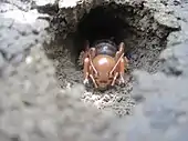 No species have wings with sound-producing structures; moreover, evidently none has structures it could use to hear sound.[4][5] This contrasts with true crickets and katydids, who use their wings to produce sounds and have hearing organs to sense sounds of others. Jerusalem crickets seem unable to hiss by forcing air through their spiracles, as some beetles and cockroaches do. Instead, the few Jerusalem crickets that do make sound rub their hind legs against the sides of the abdomen, producing a rasping, hissing noise.[6] This hiss may serve to deter predators rather than to communicate with other crickets. For such purposes, Jerusalem crickets rely on substrate vibrations felt by subgenual organs located in all six of the insect's legs.[7]