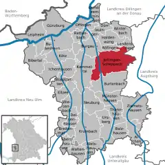 Jettingen-Scheppach is a market community in the Günzburg Landkreis in the Schwaben (Swabia) Regierungsbezirk in Bavaria. It lies between Ulm and Augsburg. Its population as of 1 December 2005 was 7,044.