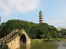 The East Pagoda was originally built in 869 or 969 and rebuilt in the following dynasties many times. Hexagon in shape, it has seven stories with the height of 28-metre (92 ft). The pagoda originally had rafters and corridors, in 1894, the British government established the British Consulate in Wenzhou near the pagoda, and forced local government to demolish the rafters and corridors.[1]